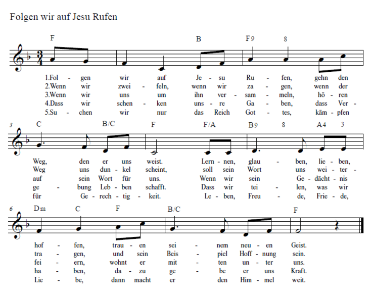Mehrmals in den Evangelien ruft Jesus Menschen auf, ihm zu folgen. So ist die Nachfolge Jesu ein Thema, das sich mit unterschiedlichen Schwerpunkten in der gesamten Geschichte des Christentums findet, und das auch auch heute noch aktuell und zentral ist. Wo können wir auf Jesus hören? Was können wir von ihm lernen? Wo verändern sein Wort und sein Beispiel unser Denken und Handeln? Das Lied will mit einem einfachen Text und einer leicht singbaren Melodie ermutigen, dem Ruf Jesu zu folgen.